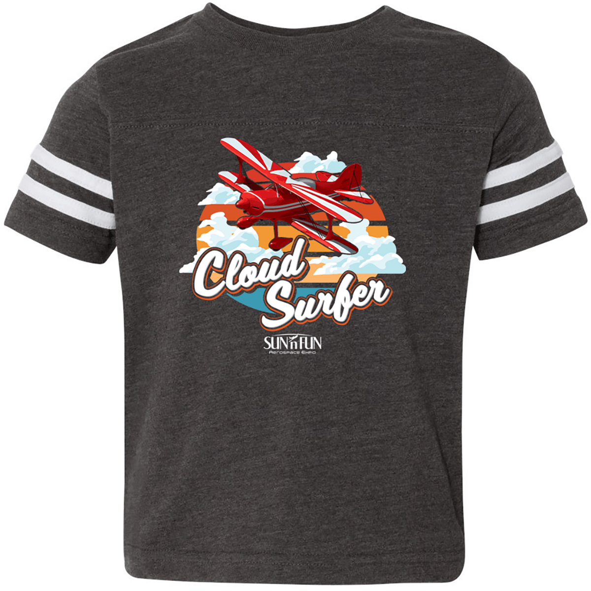 Inspire a lifetime of aviation passion with the Cloud Surfer SUN 'n FUN 2026 Toddler T-Shirt. This standout piece from the 2026 Aerospace Expo collection is designed for the youngest members of the flight line. Featuring a bold red biplane "surfing" across a sunset-inspired backdrop, this shirt captures the fun and excitement of the Lakeland airshow in a style that toddlers love to wear.