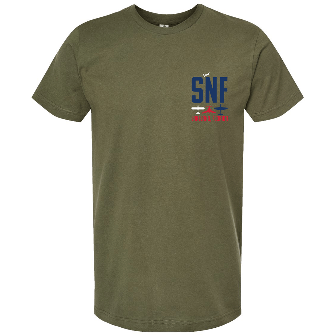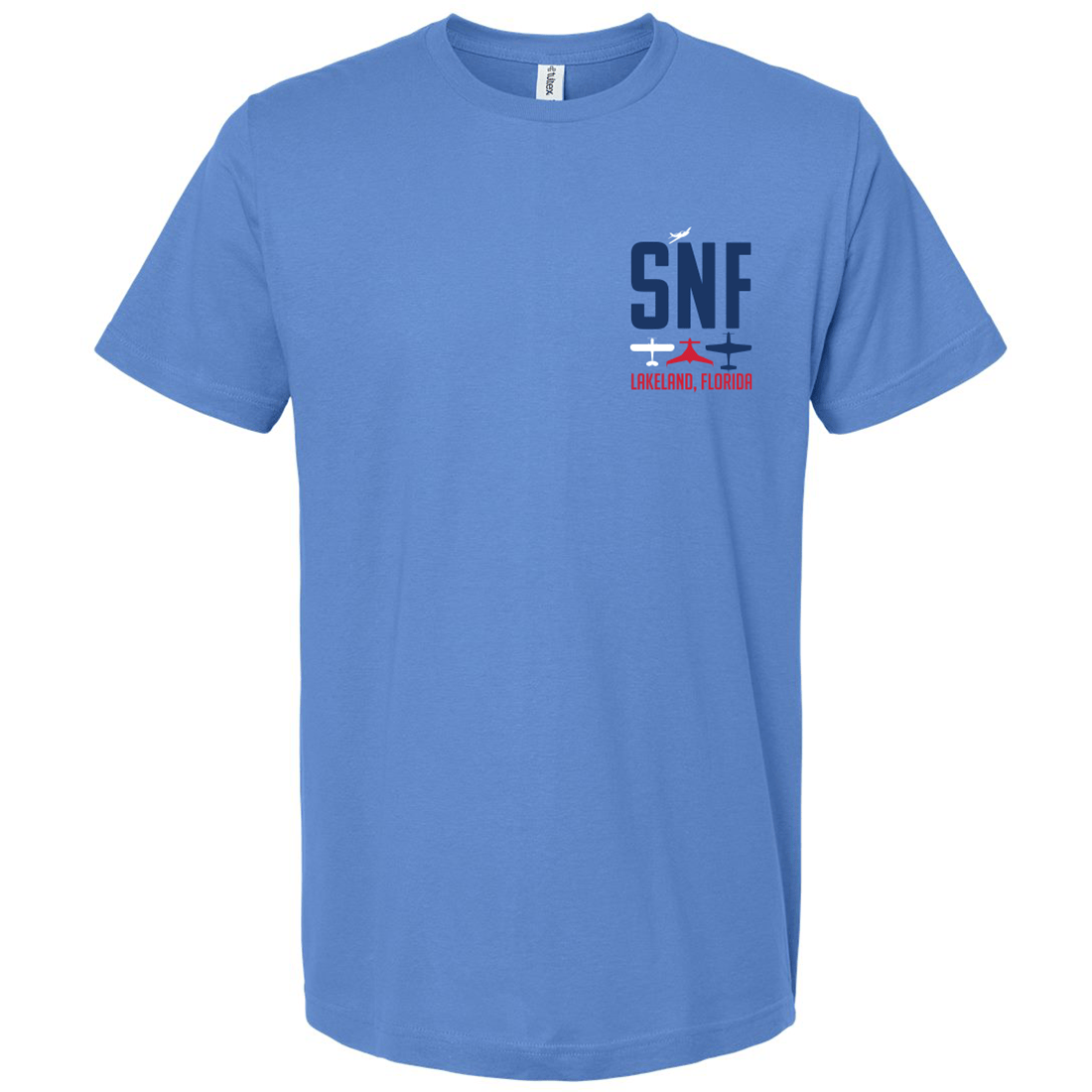 The back of the shirt features a clean aviation-style diagram of Lakeland Linder International Airport, highlighting the runways, taxiways, and layout that pilots navigate during the event. Subtle aviation details such as coordinates and field elevation add an authentic chart-inspired touch that aviation enthusiasts will immediately appreciate. The front chest design keeps things simple with a bold SNF Lakeland, Florida graphic accompanied by aircraft silhouettes representing the diverse aviation community that gathers each spring.