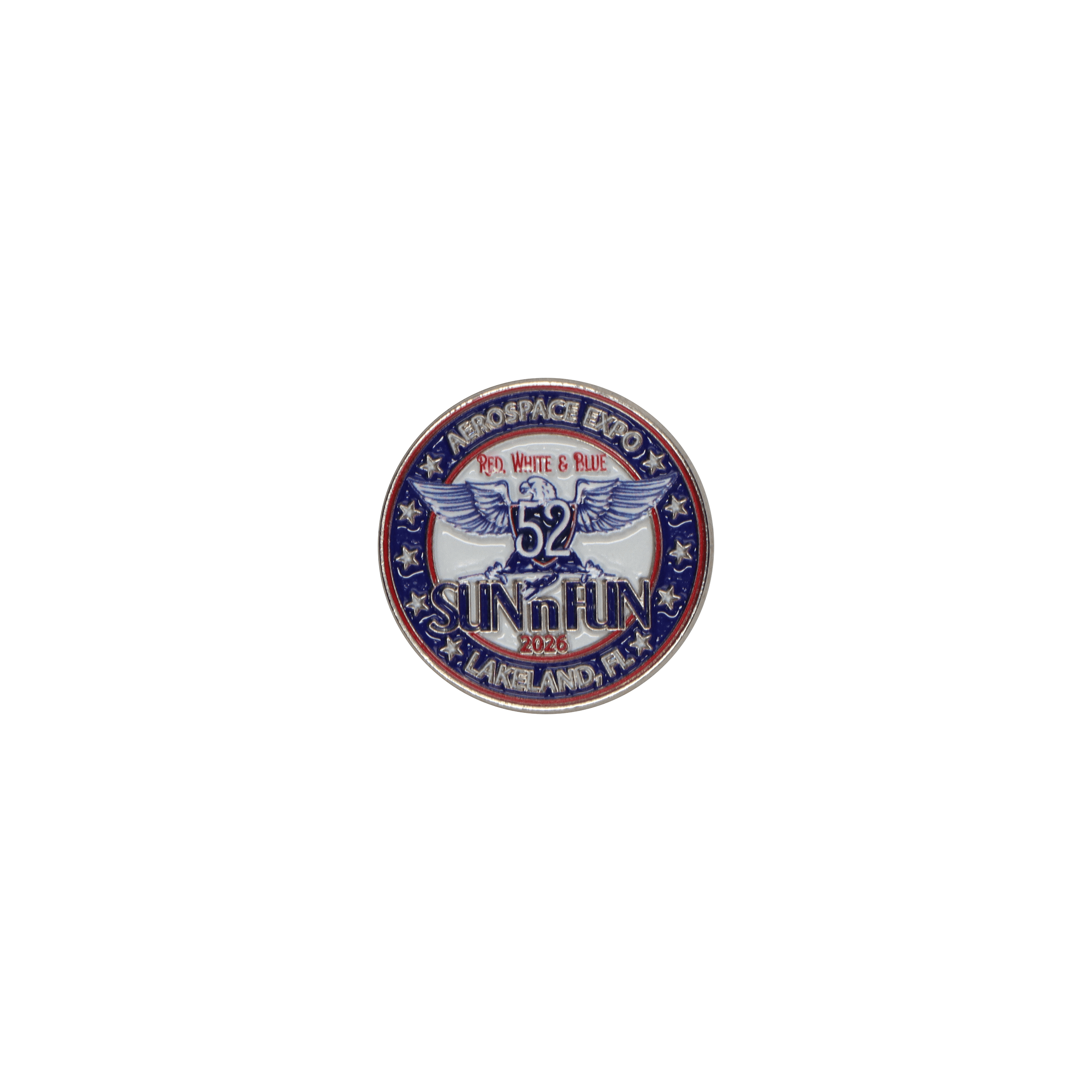 Complete your commemorative set with the Official SUN 'n FUN 2026 Lapel Pin. Sharing the same patriotic "Red, White & Blue" design as the official 2026 patch and keychain, this pin is a refined way to celebrate the 52nd anniversary of the Aerospace Expo in Lakeland, FL. The design features the iconic eagle emblem soaring above the official event wordmark, framed by a star-studded border.