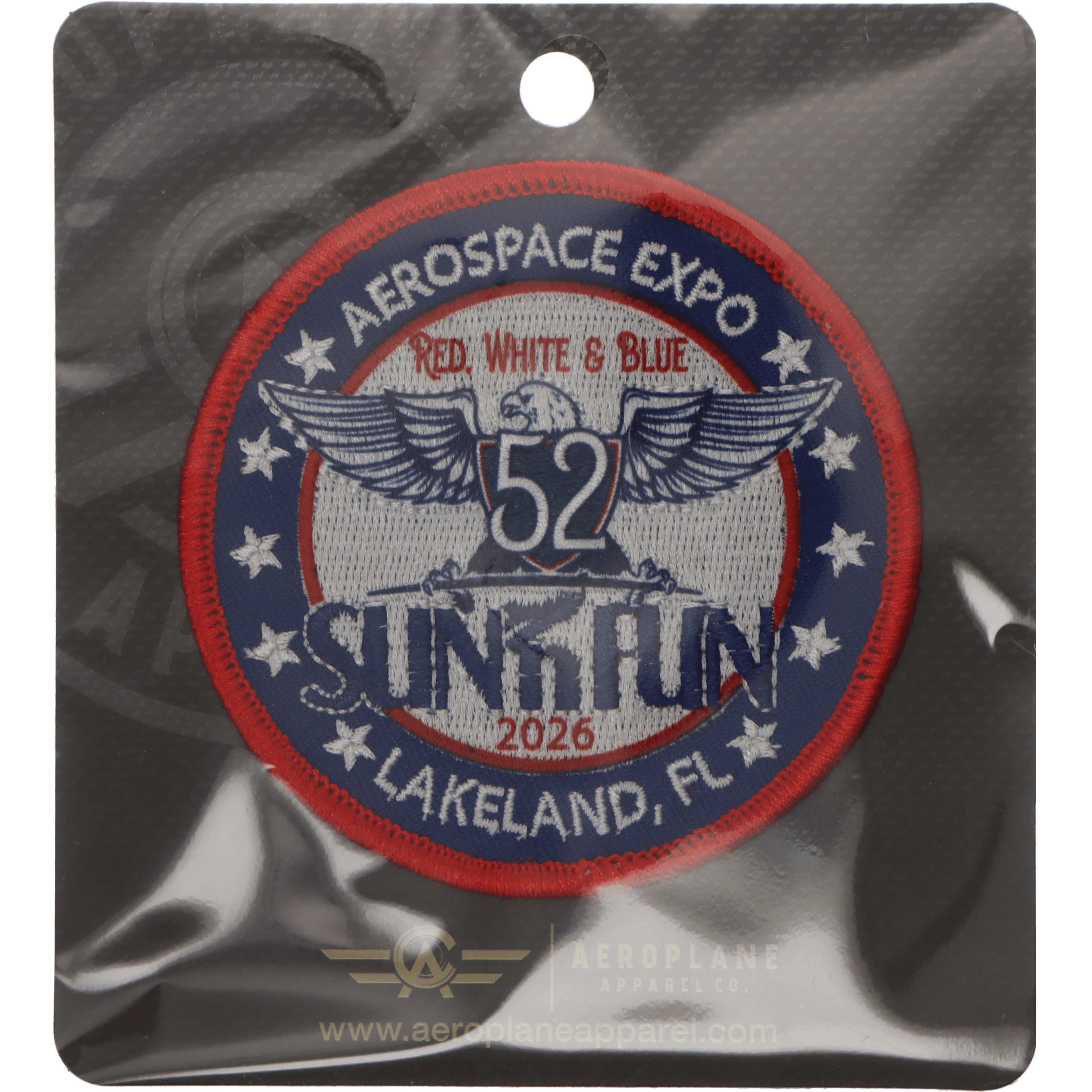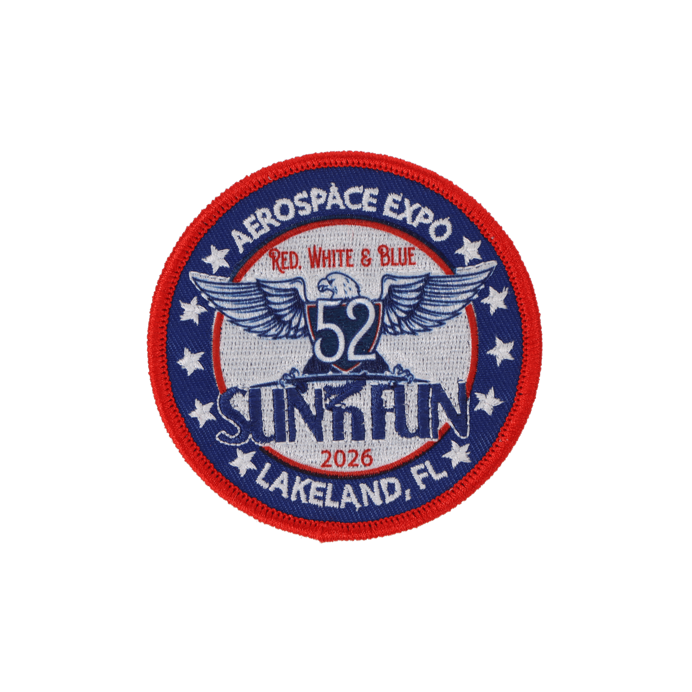 Take a piece of the airshow home with the Official SUN 'n FUN 2026 Embroidered Collector Patch. This 3-inch round patch is the definitive keepsake for the 52nd annual Aerospace Expo in Lakeland, FL. Designed with a striking patriotic "Red, White & Blue" theme, the patch features a detailed eagle perched atop the official SUN 'n FUN 2026 logo.