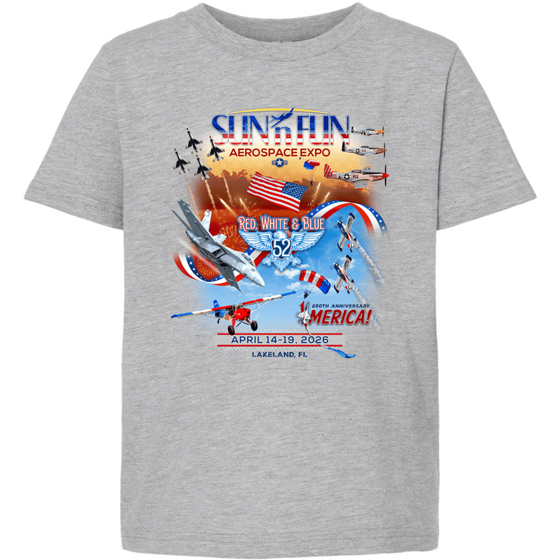 The colorful design highlights the “Red, White & Blue 52” theme along with fireworks, the American flag, and dynamic aircraft formations that bring the thrill of the Lakeland airshow to life. The artwork commemorates the 52nd SUN 'n FUN Aerospace Expo and celebrates America’s 250th anniversary, making it a memorable piece of aviation merchandise for kids who love airplanes and airshows.