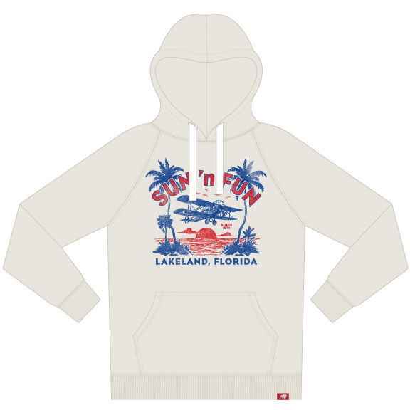 Relax in true Florida style with the SUN 'n FUN Palms and Props Hoodie. This premium hoodie captures the laid-back energy of the Aerospace Expo in Lakeland, featuring a stunning vintage-inspired graphic of a biplane cruising past palm trees and a setting sun. Whether you're waiting for the night airshow to begin or relaxing at home, this hoodie brings a touch of aviation heritage to your everyday wardrobe.