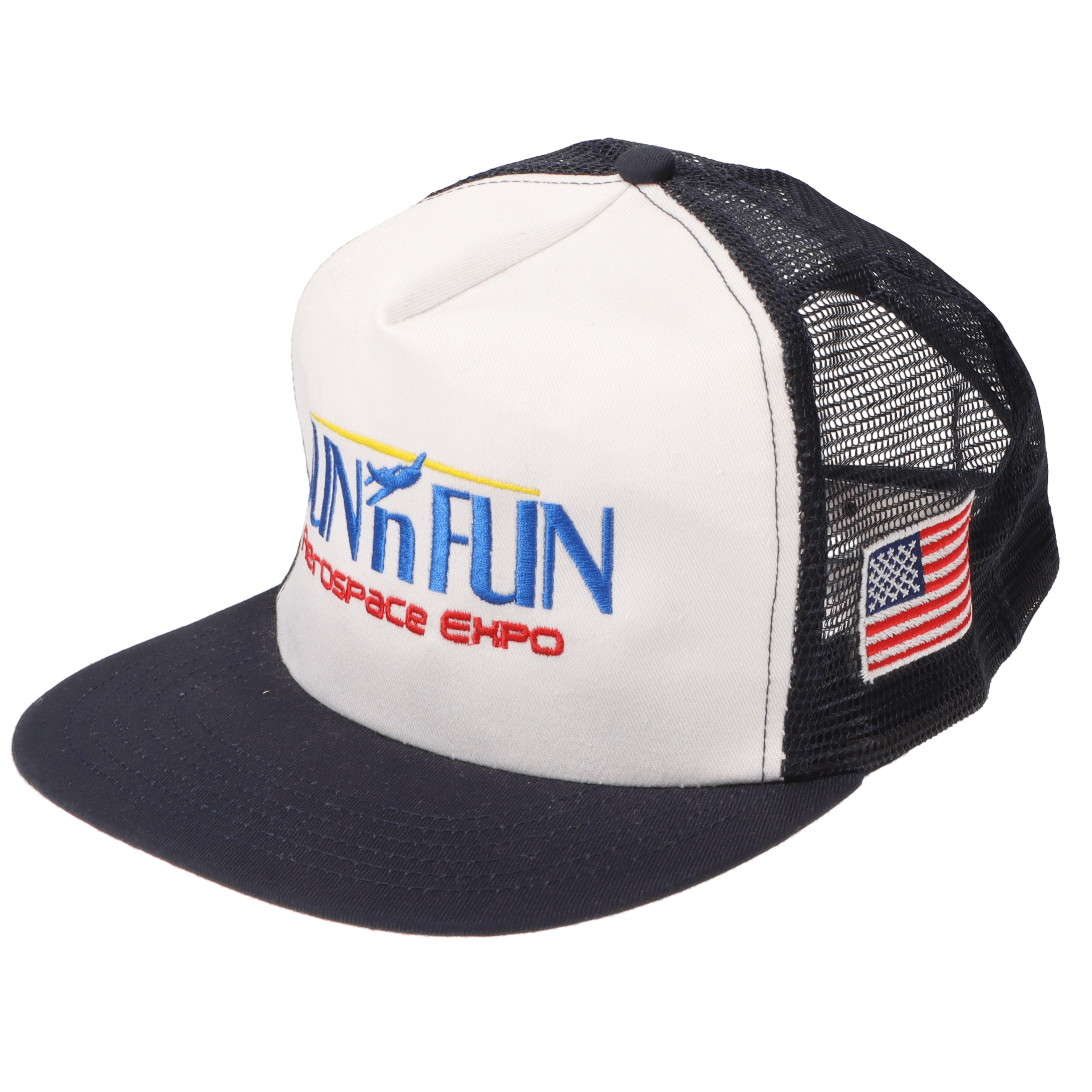 SUN 'n FUN White/Navy Five Panel High Profile Trucker Cap w/American Flag Color Embroidery