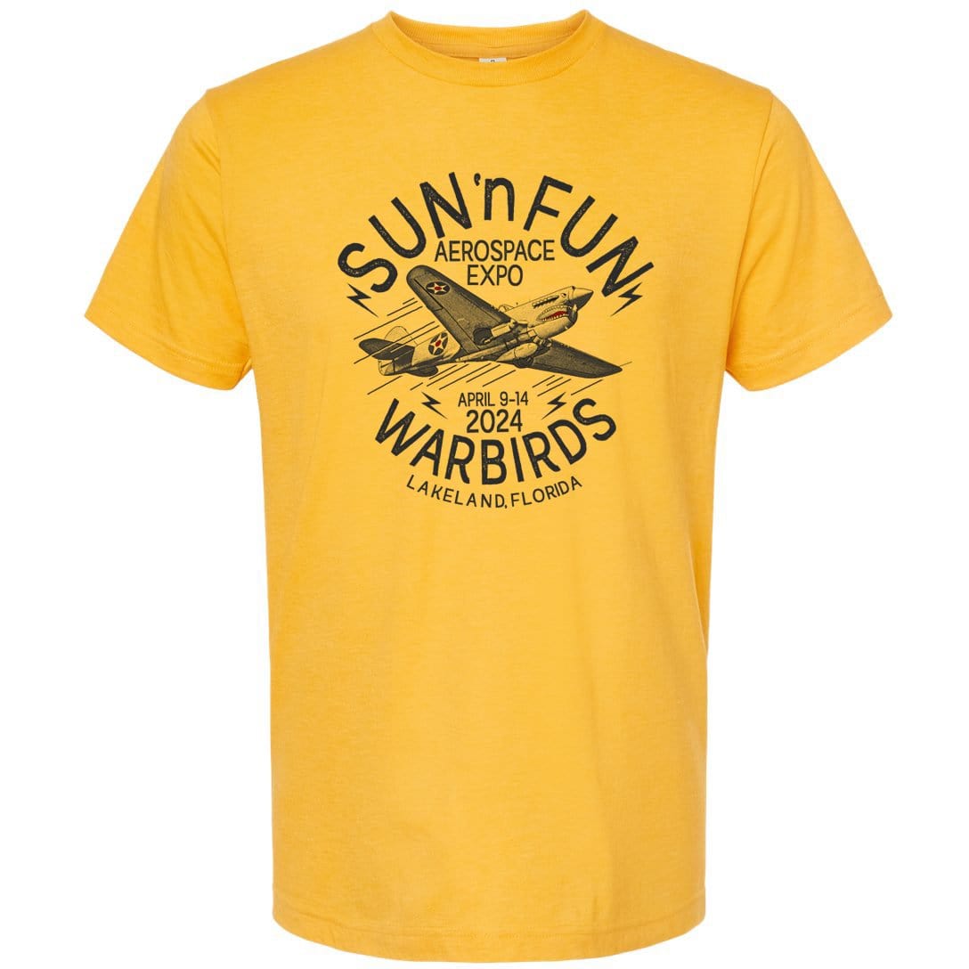 The official SUN 'n FUN t-shirt commemorating five decades of aviation excellence has arrived, featuring the legendary P-40 Warhawk in a striking retro design that captures the spirit of America's largest aerospace expo.